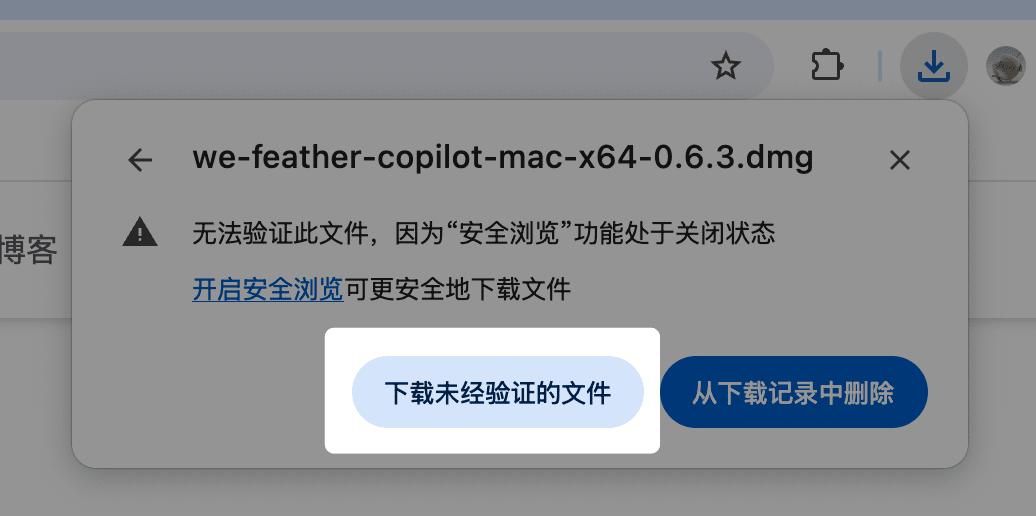 首先您需要根据您的平台下载软件,我们目前支持 Windows 10/11 和 macOS 10.15 及以上版本。如果您在下载过程中遇到了浏览器的风险提示,请不要害怕,可能是因为触发了浏览器下载可执行文件的风险提示,我们的软件是安全的,请放心使用,您可以按照下面的步骤操作。