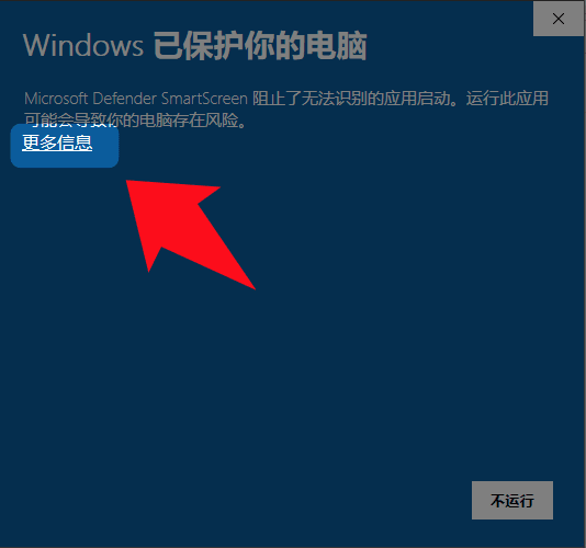 如果您是windows平台,在安装过程中遇到被 Windows Defender SmartScreen 的风险提示,请不要害怕,这是因为 Windows Defender SmartScreen 无法正确识别我们的软件导致的,可以按照以下步骤操作