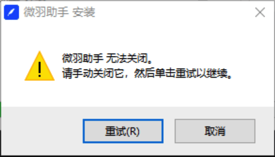 请到右下角状态栏,找到微羽助手的托盘,右键退出后重试