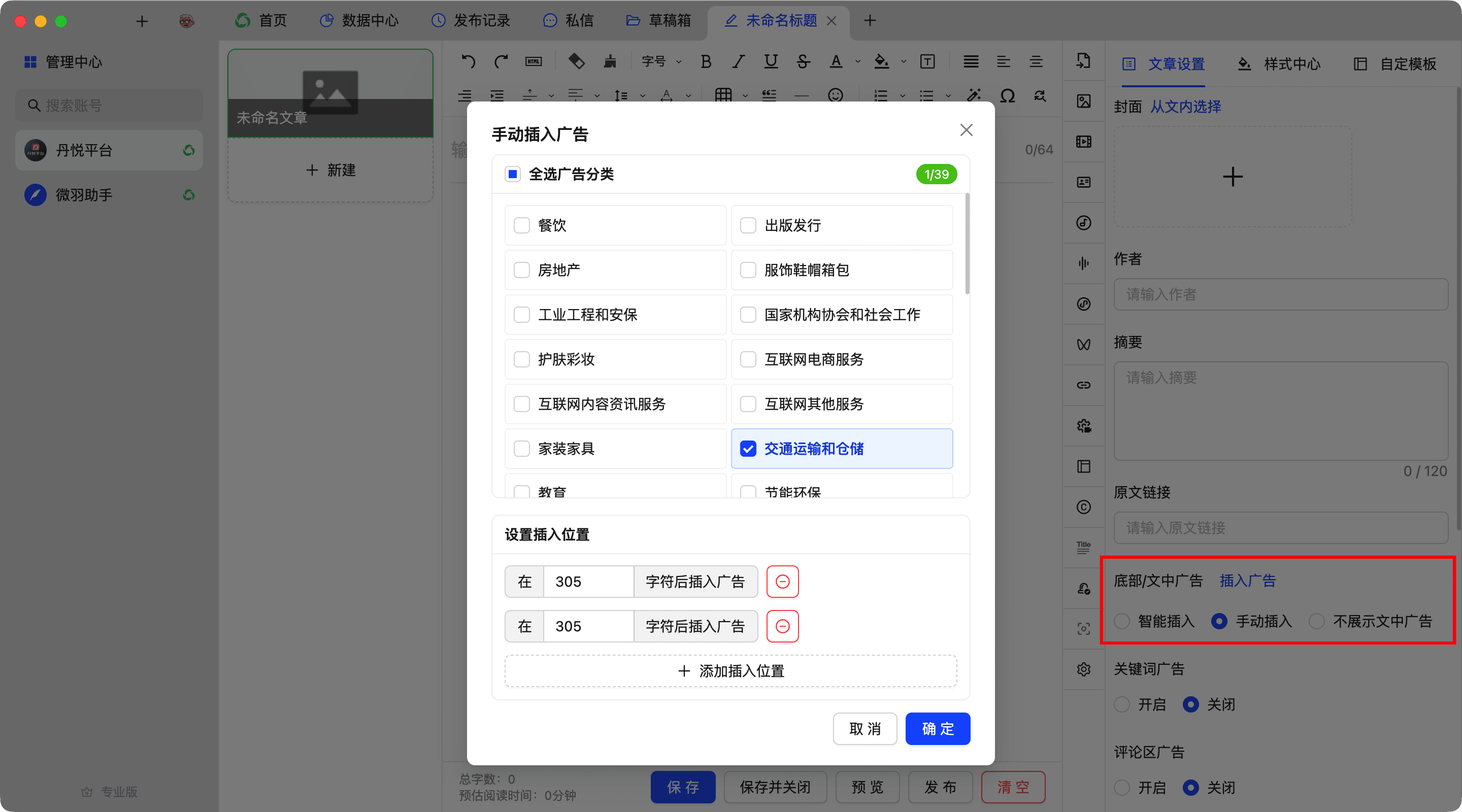编辑器支持多广告位排版,方便您根据内容节奏合理安排广告位置。