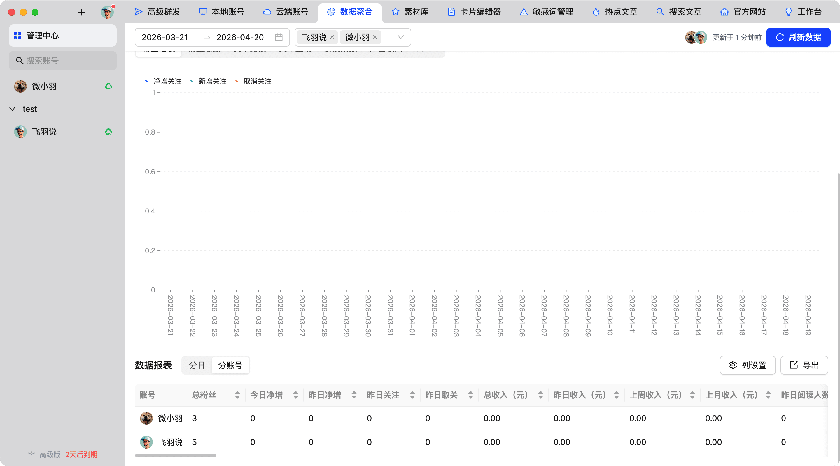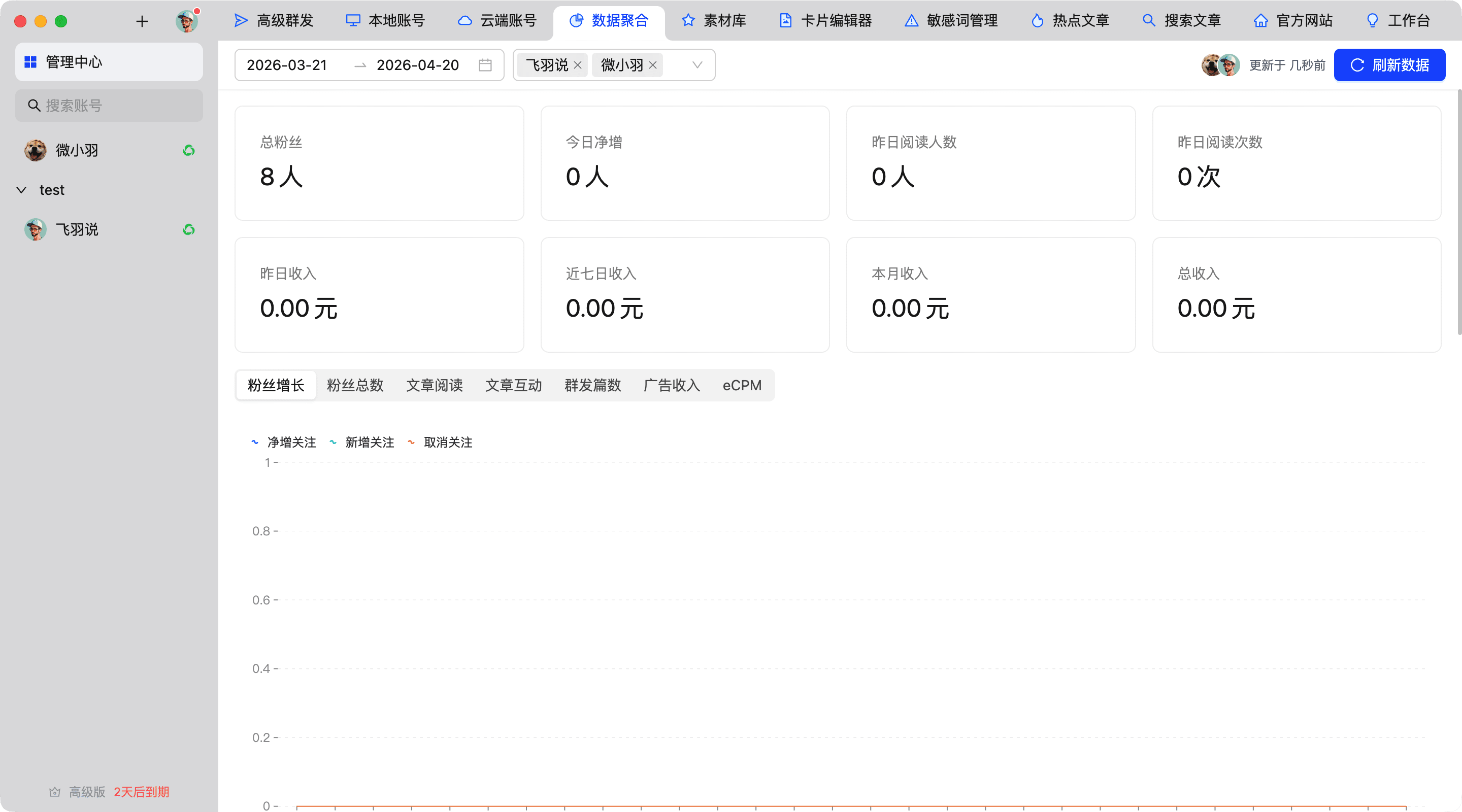 之后数据中心(单账号)与数据聚合(多账号汇总对比),数据来源于微信公众平台统计接口,在助手内以图表和表格呈现,便于日常复盘与汇报。