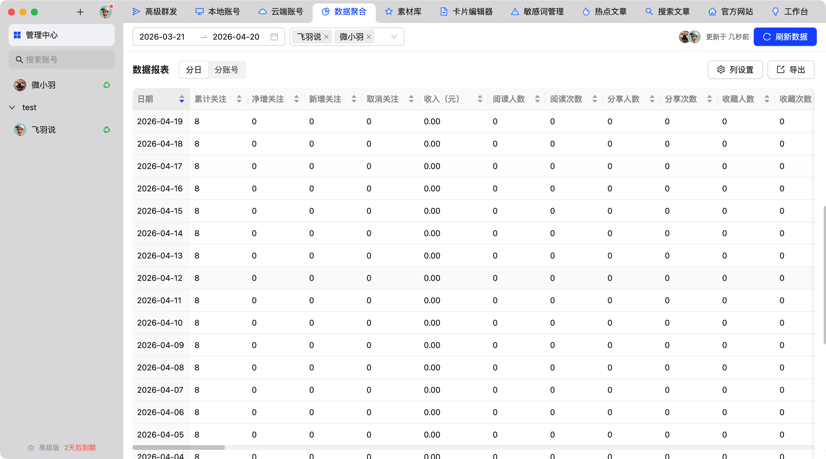 - 数据表格:按日明细;数据聚合页还会包含分账号对比表,便于横向比较各号昨日/近期表现。